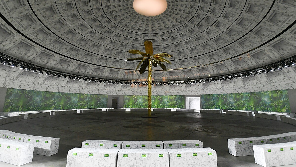 擅長將時尚與科技結合的Versace,最新2020春夏大秀同樣延續這些元素,並融入古典主義,將秀場天花板變成羅馬萬神殿,且運用數位藝術投影的方式,把青銅棕櫚樹雕塑包圍觀秀嘉賓,進到場內就能感受到,時尚與科技結合的魅力。