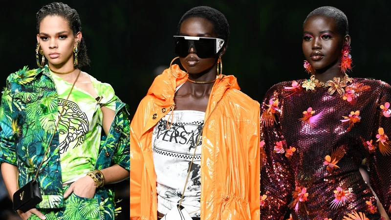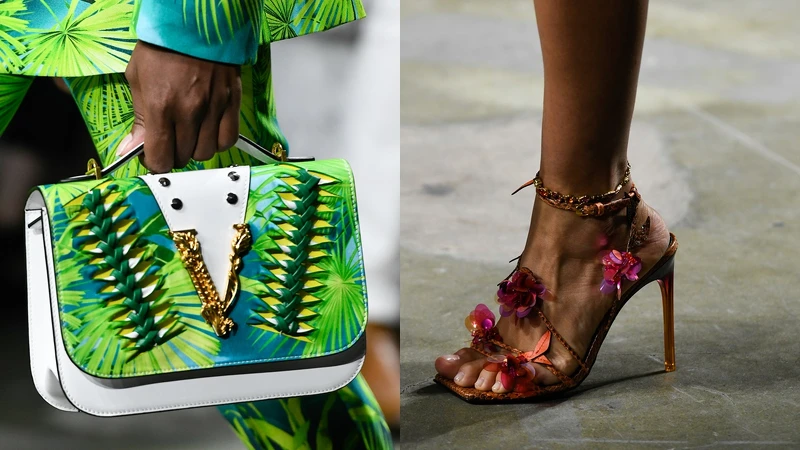 叢林印花圖案不只在服裝上可見,還有Squalo運動鞋和Versace Virtus手袋上的立體珠飾。不論是以葉形皮革裝飾,或是結合煙燻色有機玻璃鞋跟的繫帶涼鞋,可說是明年春夏系列中不能錯過的單品。
