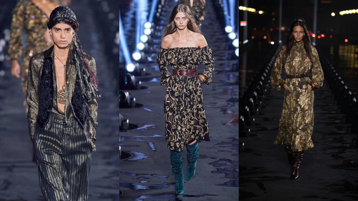 本季更重新詮釋聖羅蘭先生的經典作品,Turban頭巾、以金蔥絲線刺繡而成的印花,七十年代的拋光金色搭襯在墨孔雀綠的雪紡布料上,Anthony Vaccarello將過去融合現在,加入當代的摩登元素,詮釋聖羅蘭女子的顧盼風情。