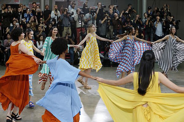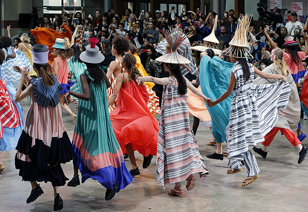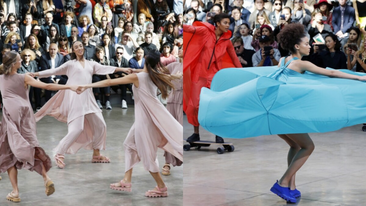 服裝秀的一開始,幾位穿著粉紫色洋裝的模特以芭蕾舞者的曼妙舞姿為大秀揭開序幕,藉由服裝設計採用的「柔墜平織」展現布料那輕盈且最具初始裝飾的「一塊布」直覺。其後像是運用100%尼龍製成的風衣、隨風起舞的織物…均充分體現了「一塊布」可帶給大家的無限觀感與美學。當中一幕以吊鋼絲裝置打造、從空中緩緩降落的洋裝和帽子,不但巧妙替定點模特換上衣裝造型,更看見品牌源源不絕的趣味創新。
