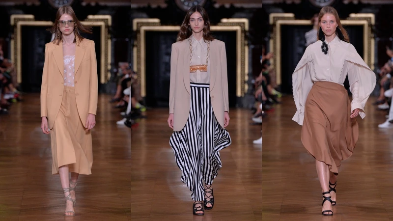 本季的創作靈感凝聚了過去、現在以及未來女性的堅韌態度,好比流動多變碰上平隱圖形、奇異古怪匯合簡約款式…這些經過建立在解構組裝的元素,無形之間傳遞著女性的二重性,也因此在造型中能時常看見剛與柔的混搭,如柔美的波浪線型和剛強的墊肩西裝,又或是西裝裝束與透膚上衣的強烈對比等,均是本季Stella McCartney強調的重點風格。
