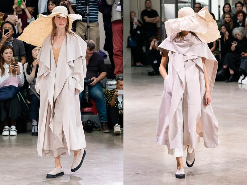 到了中場畫風開始轉變,現代都會感十足的100%尼龍製成風衣外套,也以最少的縫製來傳遞「一塊布」輕盈感受的概念,當模特兒將外套敞開並踩上滑板奔馳在秀場上,透過風的吹佛所帶來的蓬鬆動感風采,給人一種生動輕透又自由的淋漓盡致暢快感。