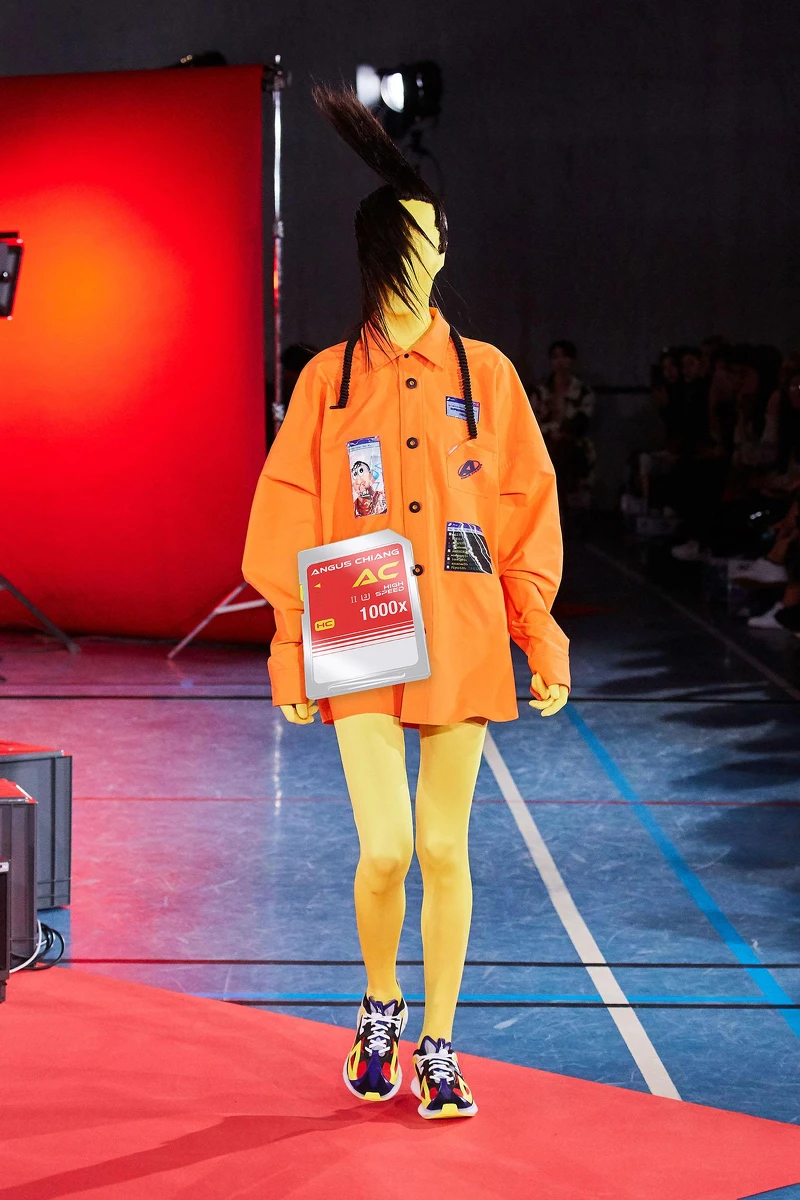 ANGUS CHIANG與HTC合作,透過虛擬實境的技術,讓服裝上的印花不只是印在服裝上的圖案,更可以變成手機上的有趣動畫。江奕勳讓秀模們全都穿上綠幕、藍幕胎衣,透過虛實交錯的手法,讓設計跟上科技時代,但又透過細節緬懷無名小站等已成為最美回憶的網路社交場域。