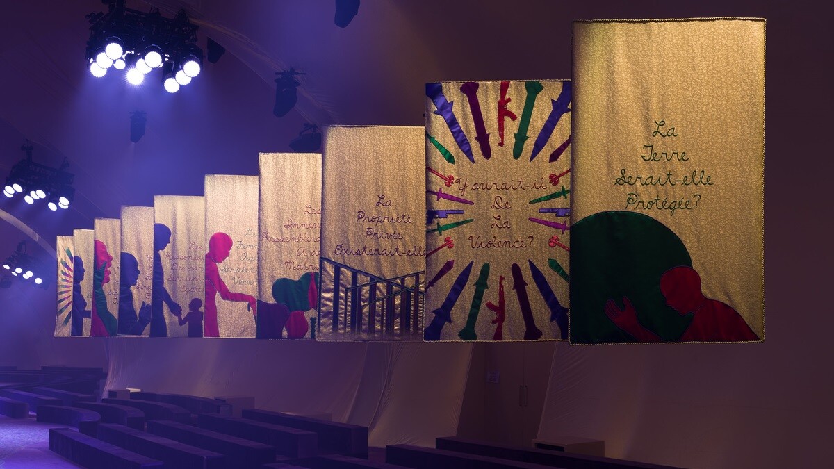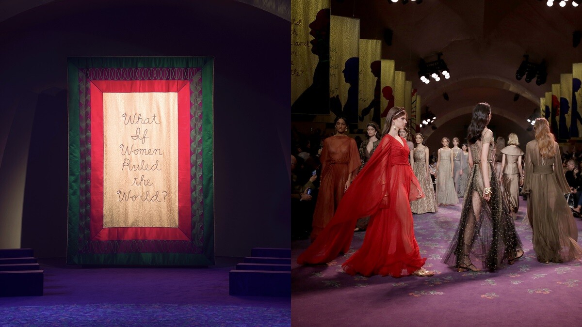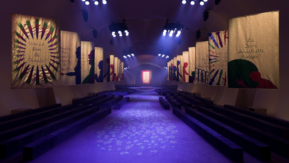 秀上展出21張大型刺繡縫掛布,上頭繡上英語和法語問句,例如『What if women ruled the world?**(如果世界由女性主宰?)』這呼應了 Judy Chicago 長期鑽研女性在人類史上地位的研究。這批掛布來頭不小,是出自Dior在印度贊助的一間刺繡學校。由於在印度,刺繡工藝只能由男性從事,但這批作品指定女性學員縫製,藉此表達Judy Chicago和Maria Grazia Chiuri支持女性力量的決心。