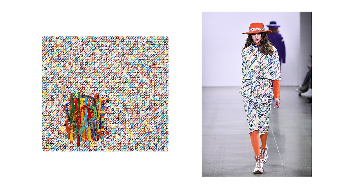為將經典版型的服裝,如西裝、風衣、襯衫、洋裝等重新詮釋,周裕穎運用莊普作品充滿當代藝術風格的色彩,加入各種繁複作工處理,「以衝突解讀經典,取得完美的不平衡」。