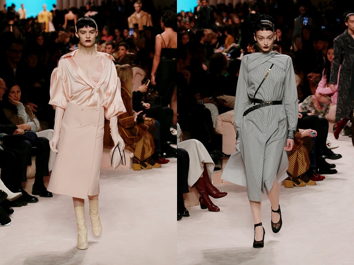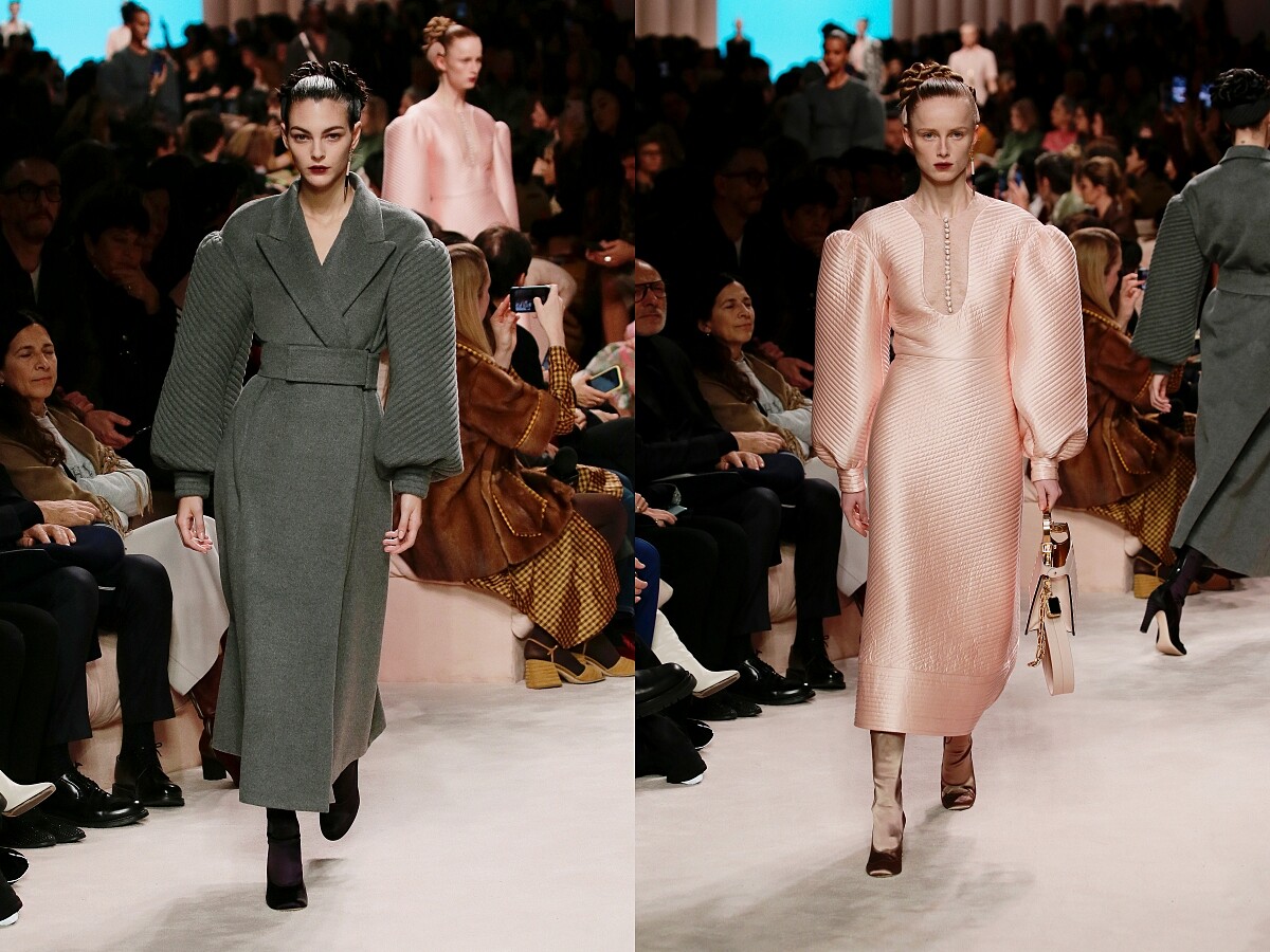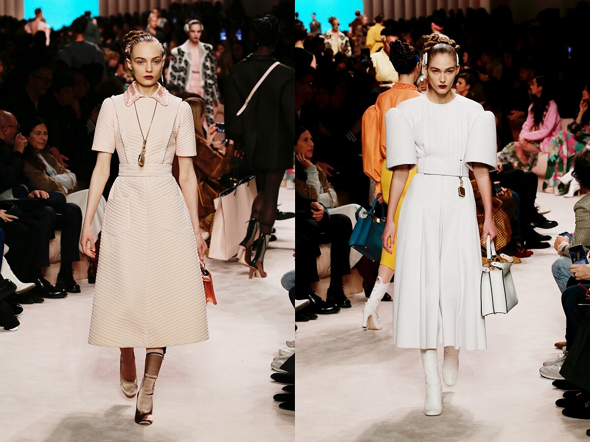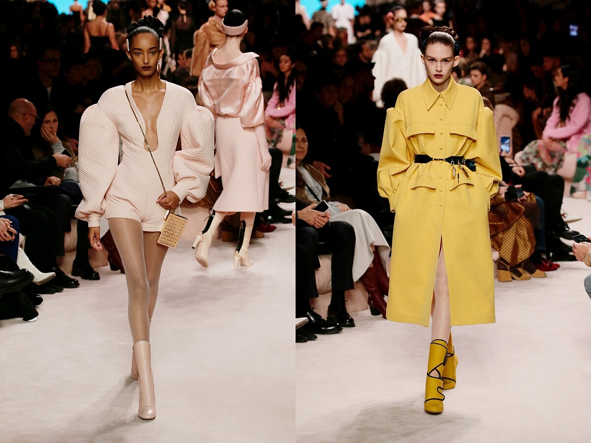 本季創意總監Silvia Venturini Fendi重現女人從閨房走進辦公室的畫面,在家她是一名柔媚嬌弱的女子,踏出房門後她是一名幹練有品味的氣質女人。開秀時就以誇張的羊腿袖大衣、粉色水滴領羊腿袖洋裝,強調FENDI女人在家時的性感與辦公室的幹練這種雙面特質。