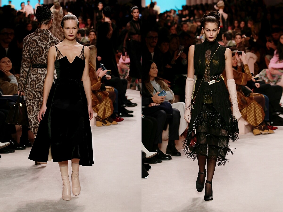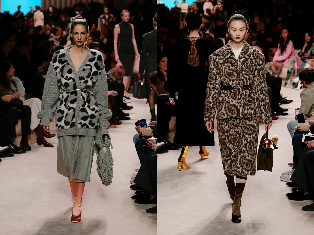 霸氣袖型配合收腰剪裁,強調亦剛亦柔的特質;喀什米爾羊絨、皮草、皮革與蕾絲等材質的拼接,帶出FENDI在材質上一貫的奢華風格。拉絨毛料衣裳和嵌花皮草上的變形水滴般豹紋圖案,搭配串珠流蘇或霓虹耀眼的杏黃色Chantilly蕾絲,大膽而危險的性感姿態,連女人也不禁被這股撩人氣息吸引。