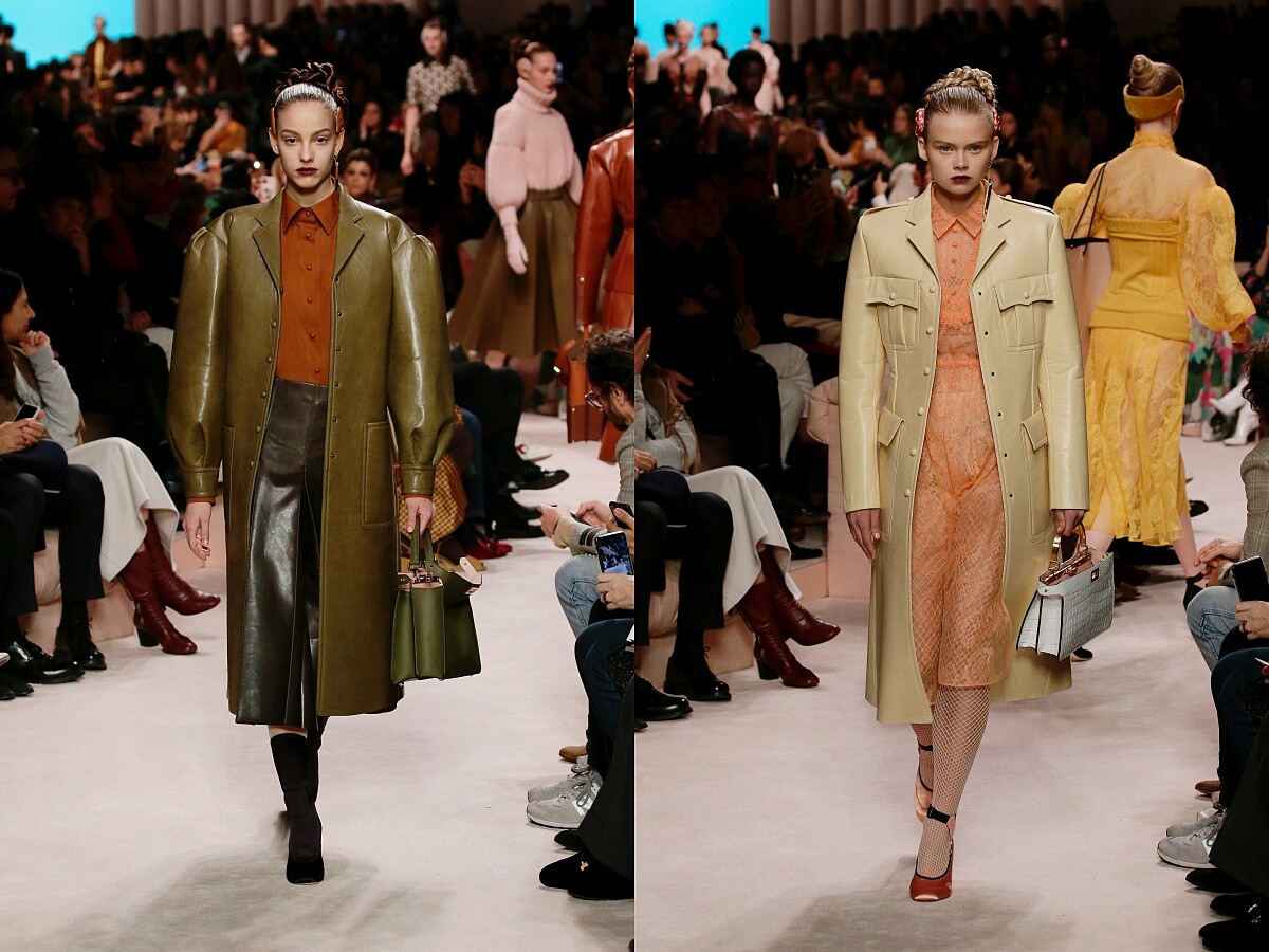 色調上,秀場主色調霧粉色就是主軸,伴隨著混凝土灰與各種中性色彩如駝色、咖啡色等,與FENDI黃互相輝映,在柔美與專業的剛毅風格間取得完美平衡。值得注意的是,本季搭配上也強調二元論,運用對比色系如紅與綠、綠與橘及「One Tone」單色調的搭配,帶出優雅風格。