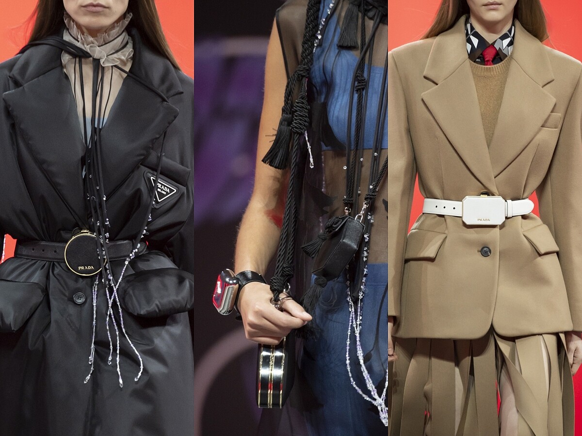 不錯過任何收納的空間!這句話恐怕就是2020秋冬PRADA最想在配件上強調的重點,腰帶上能裝上個硬殼小包,收納口紅或者零錢都好。隨時隨地都有放置小物的空間,如此一來即便包包再小都不用怕,因為多帶幾個小包出門,不就好了嗎?