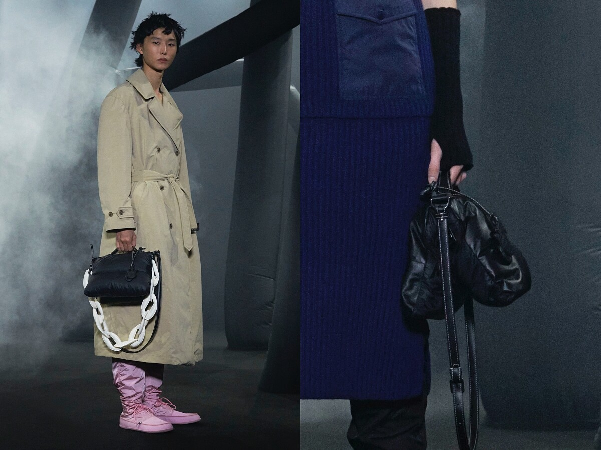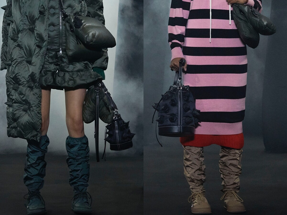 MONCLER GENIUS最新加入的設計師還包含執掌個人品牌與百年老牌LOEWE的英國設計師JW ANDERSON,本季他以MONCLER經典的羽絨材質,打造出兩款獨具特色的「枕頭包」,其中一款為兩個方正羽絨袋合而為一的包款,加上PVC鎖鏈或是皮帶,都能展現不同的潮流風格。另一款式加上尖角營造出類似狼牙鉚釘的意象,貝殼包的輪廓,讓這款狼牙小枕頭更具個性。