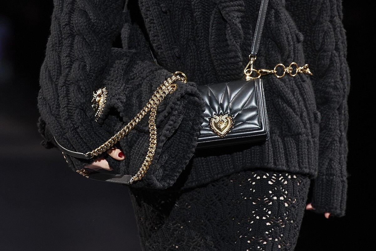 本季DOLCE&GABBANA (DG)秀場少了以往招牌的奔放西西里島熱情元素,秀場上清一色的黑與白,加入點紅玫瑰元素,展現一貫的義式奢華感,或許是因為受到先前中國抵制的影響。但總之服裝上黑白灰的呈現,反而更能讓人更聚焦在配件上。