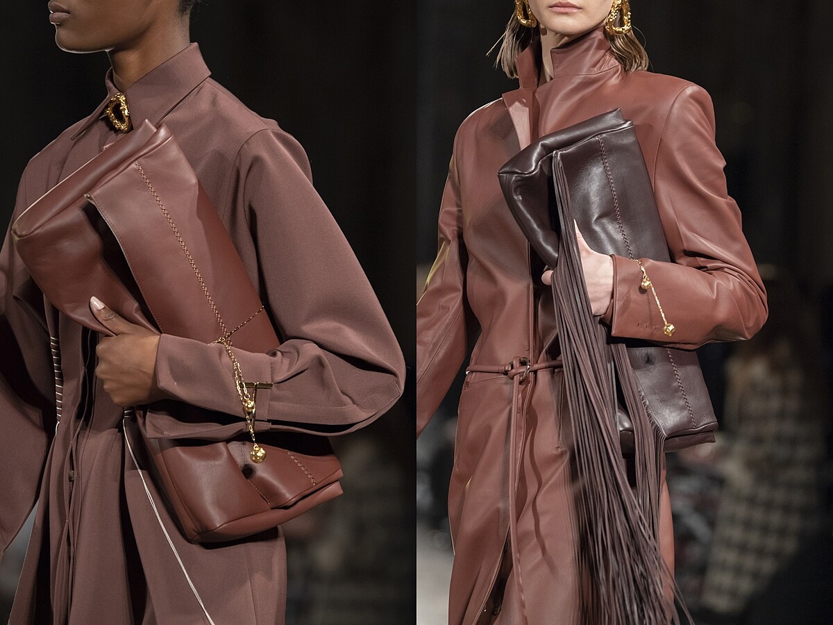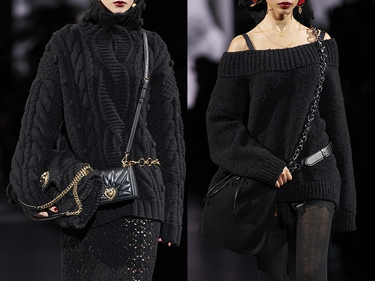 秋冬秀場出現許多粗針織材質,也採用到配件上,大型的翻蓋包亦或者腰包與水桶包等,均採用毛線材質。呼應秋冬所需要的溫暖風格,肯定會讓女人們愛不釋手,同時也有加上腰鍊能變成腰鍊毛線包的完美組合。