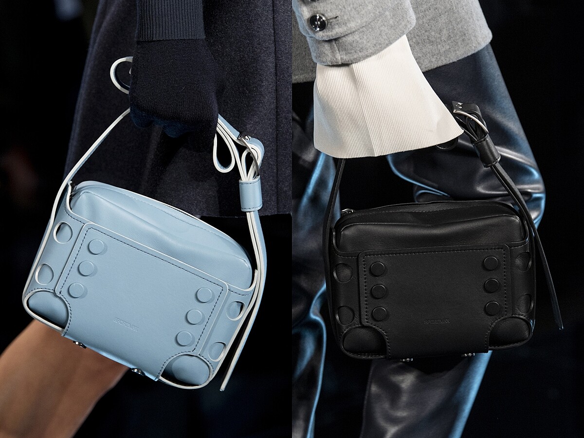 方形相機包,已成為現下時髦女性必備包款,SPORTMAX秋冬秀場上出現一款加上圓形鉚釘裝飾的箱型拉鍊相機包,如同軟式迷你行李箱感的手袋,很適合想入手基本款,卻又想帶點獨特個性的女子。