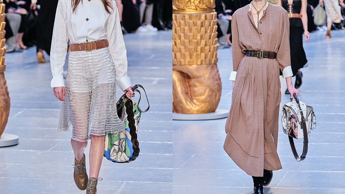 創意總監Natacha Ramsay-Levi特別邀請三位女性藝術家,透過畫作、雕塑與詩詞展演2020秋冬大秀的方式,著實讓人耳目一新。本季配件以「時光的光澤」為主題,創意總監Ramsay-Levi多年好友畫家Rita Ackermann,所創作的插畫圖案出現在多款手袋上。另一個焦點則是首度亮相的雙環扣Franne小斜背包搭配Fredy托特包,包上壓印了搶眼的幾何感字母。