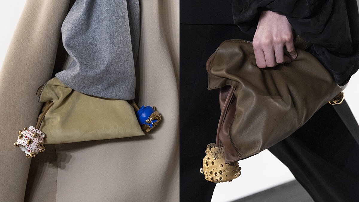 Loewe創意總監Jonathan Anderson找上日本陶瓷藝術家Takuro Kuwata合作,將配件賦予陶瓷美學,其中就屬飾有陶瓷品的手拿包最吸睛,採用麂皮、皮革材質打造,開合方式為束口設計,在束帶的兩側飾有不同形狀的陶瓷藝術品,絕對是今年秋冬熱賣的包款之一。