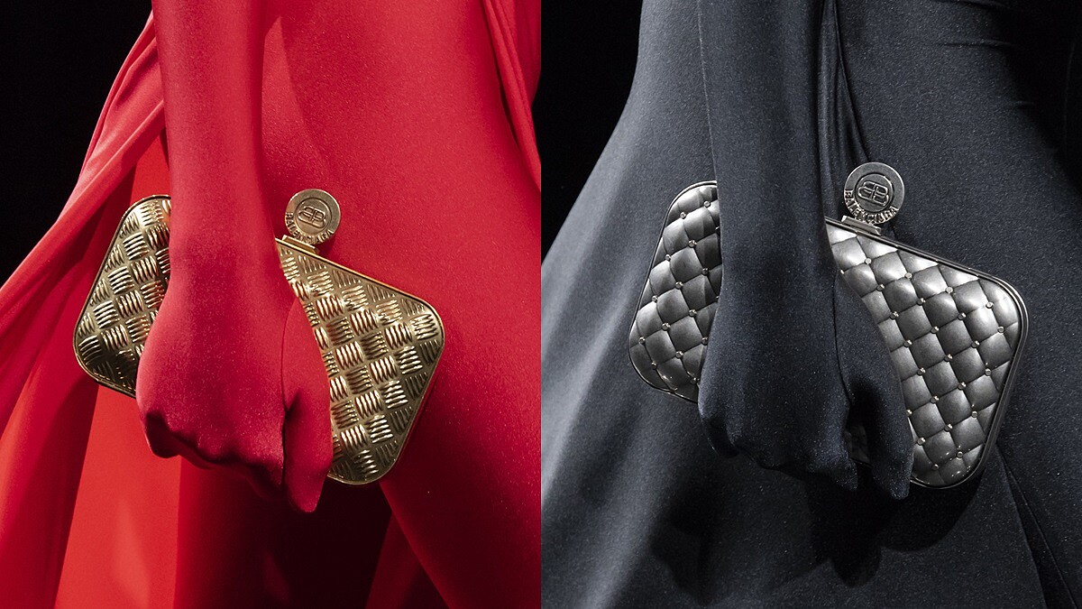 每次辦秀都有驚喜帶給大家的Balenciaga,2020秋冬同樣沒讓人失望,將秀場直接浸在水中,天花板也投影上海洋、烈火、天空等大自然景像,大量的漆皮、墊肩元素貫穿服飾系列。配件部分則出現宛如便當盒造型的手拿包,包身上象徵品牌的BB Logo相當醒目,有黑、白兩種色選。另一款則是壓印鐵網紋路的手拿包。