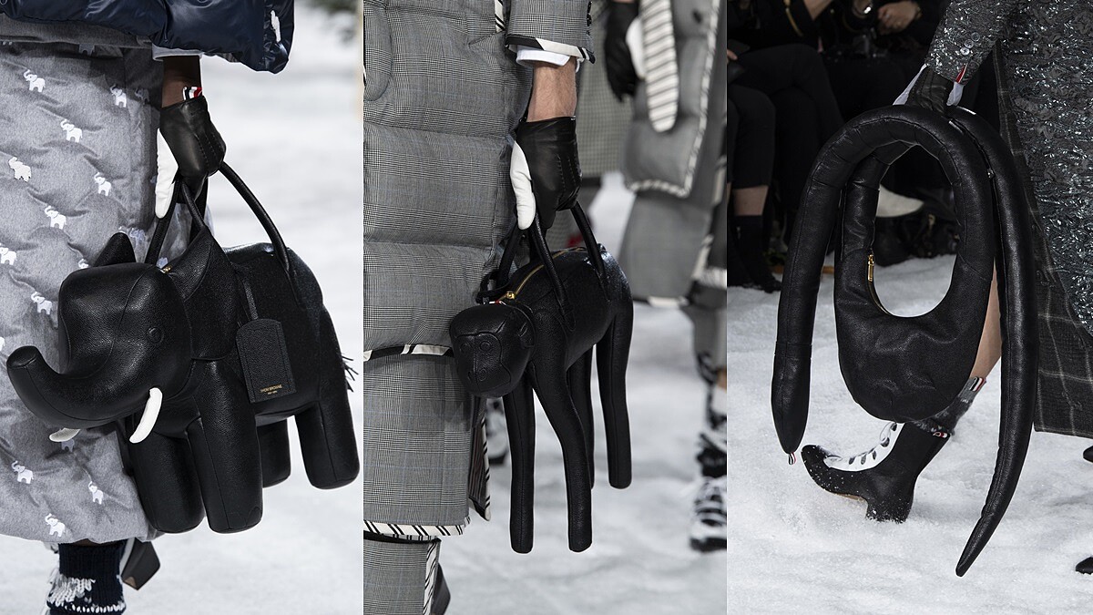 延續品牌一貫的調性,Thom Browne本季再度以動物元素貫穿整個系列,把秀場打造成冰天雪地的森林,辦成動物的模特兒們就從一扇木門走出,展開這場精彩的秋冬系列。受到關注的可不只模特兒,他們手上拎的手袋更是吸睛,相較於前幾季的動物手袋,此次Thom Browne把動物更實體化了,像是小羊、蟒蛇、猴子、駱駝、鸚鵡...等,盡是之前從未見過的動物。