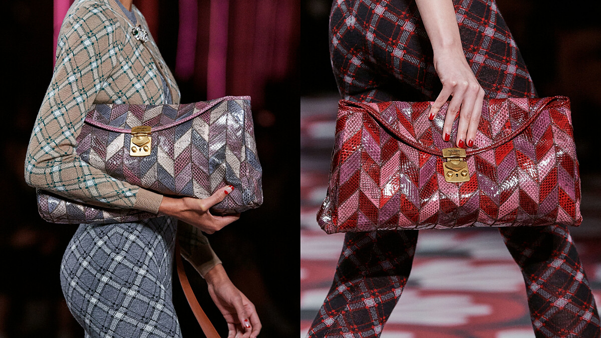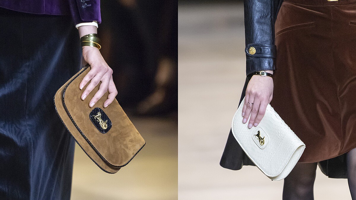 延續春夏復古潮流,Miu Miu帶著60年代的復古風格與獨有的俏皮正式回歸,不讓2019年大放異彩的BOTTEGA VENETA雲朵包專美於前,各式手拿包為本季一大看點,創意總監Miuccia Prada將經典抓皺樣式或結合金屬,或點綴邊框,再融合復古圖騰的亮皮革,幻化出更多樣化的選擇。