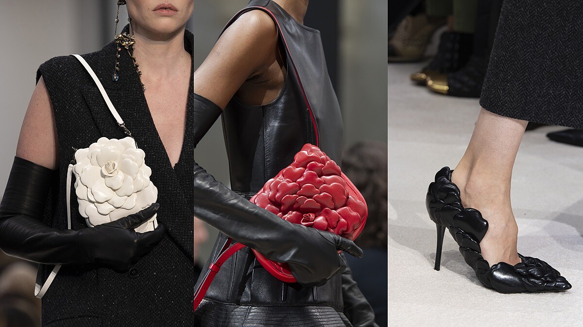 擅長使用花朵、花卉元素的Pierpaolo Piccioli,此次2020秋冬大秀將花更顯具體化,展現於服裝、手袋甚至是鞋履上,以訂製工藝將花辦堆疊,打造成肩背包、托特袋,就連高跟鞋上也是採用同樣的手法呈現,搭配紅、黑、白色系相當前衛。