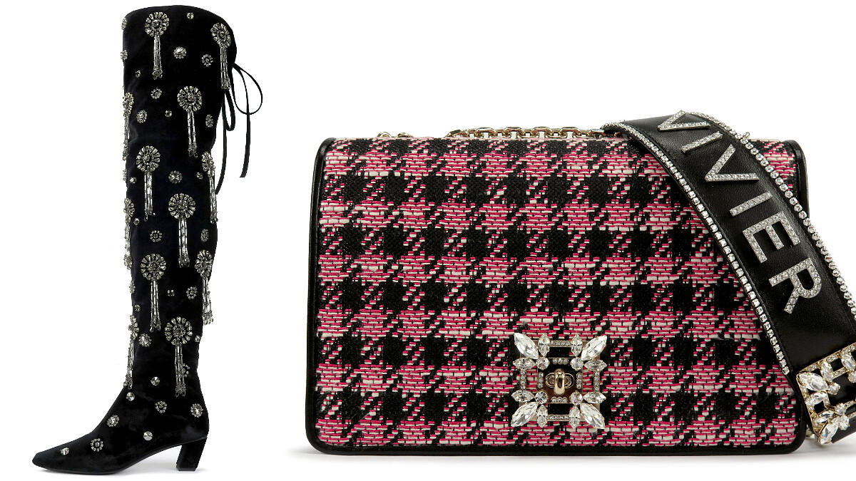本季最具話題鞋款「Belle Vivier Cuissarde 刺繡長靴」,其獨特之處在於每雙靴子都由不同材質包括皮革、天鵝絨、羽毛、水晶和珍珠加以手工刺繡組合而成,每一雙作品需耗時12個小時才能完成,稀有且獨一無二。主打包款Miss Vivier斜背包則完美呈現出創意總監Gherardo Felloni鮮明的個人特色,以格紋毛呢圖案為底,並飾有一個呈葉片形態的迷你水晶飾釦,背帶點綴著寫有Roger Vivier品牌名稱的水晶,經典設計結合Felloni醉心的珠寶設計工藝,復古與時髦兼具。