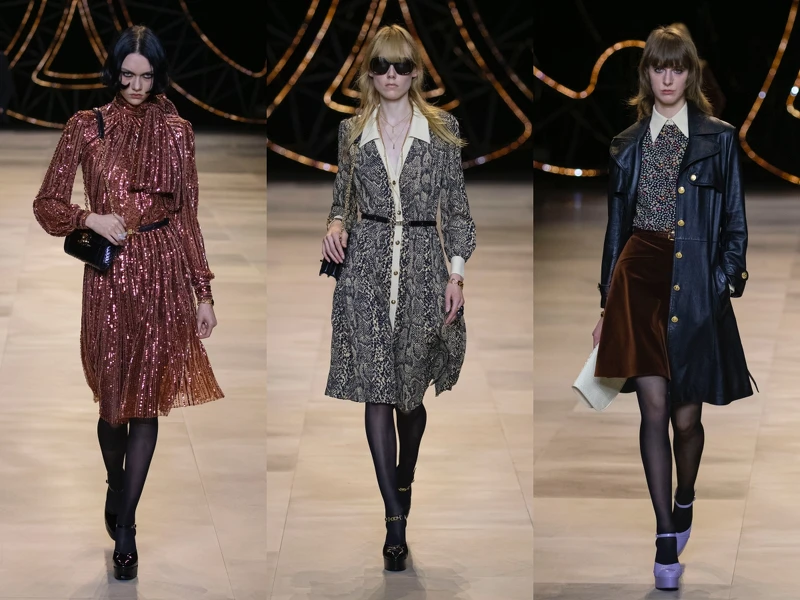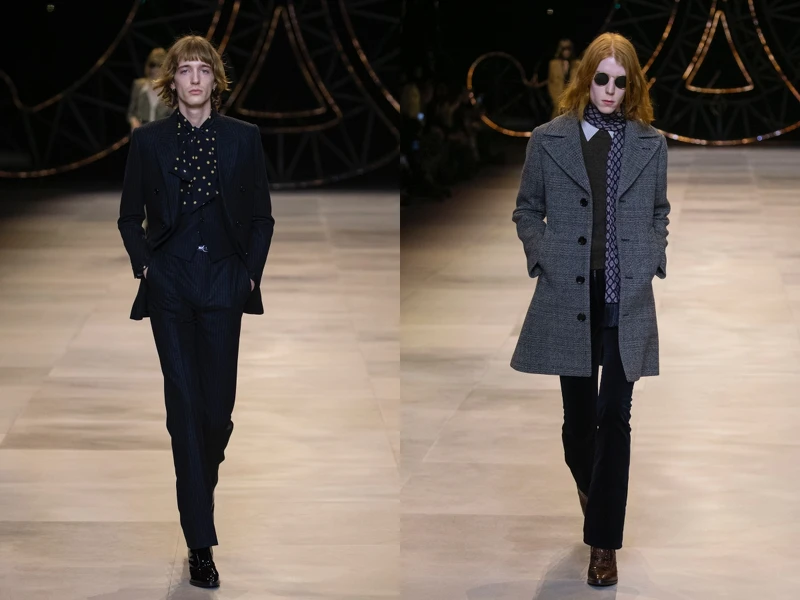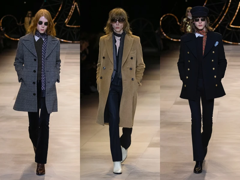 Hedi忠於自己熱愛的搖滾風格,並融入70年代復古懷舊的樣貌,古典風格的蝴蝶領荷葉邊襯衫、書卷風格的斗篷、燈芯絨長褲、天鵝絨獵裝、華麗刺繡洋裝、盧勒克斯(LUREX)金屬細絲光澤的連身裙、厚底防水台涼鞋與麂皮長靴等,每個細節均刻畫出70年代資產階級的優雅著裝樣貌。男裝也延續女裝設計風格,搖滾嬉皮之餘又有一些浪漫餘韻。