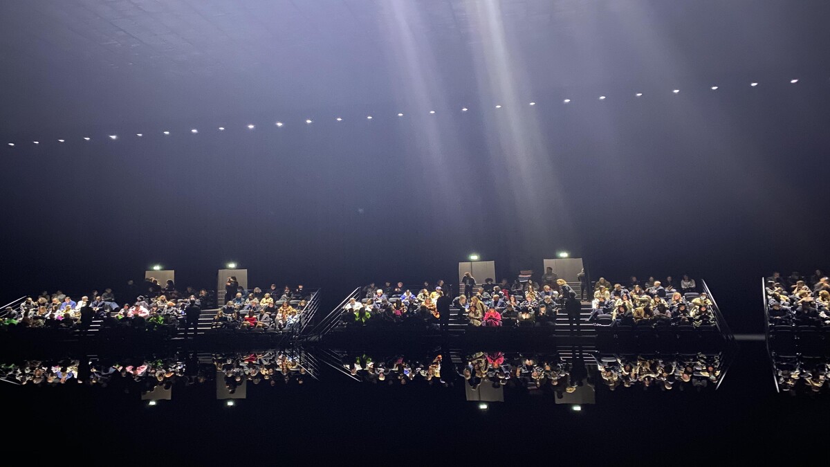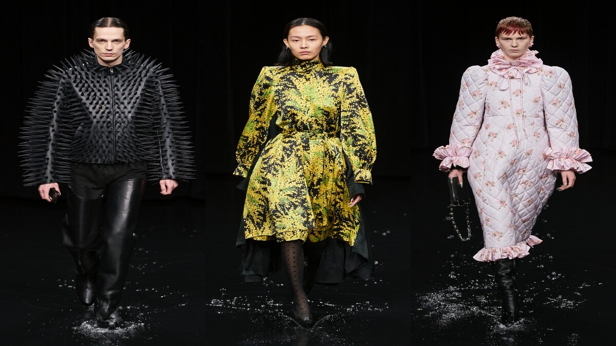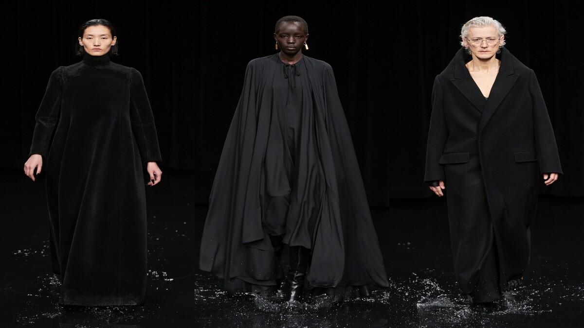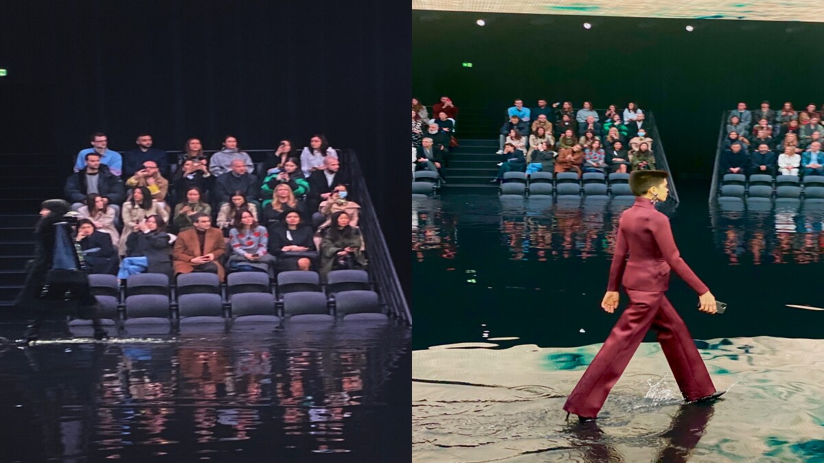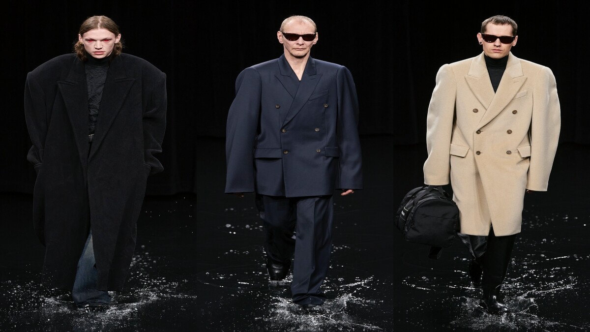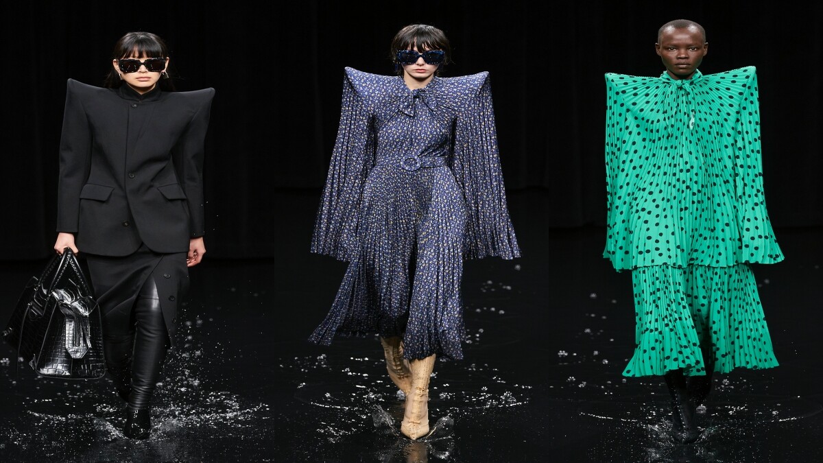 BALENCIAGA(巴黎世家)甫於台灣時間1日晚間7點發表2020秋冬系列男女裝,105套設計在「暗黑系」袍服展開,模特兒們踏水而來,視覺張力十足的秀場,讓BALENCIAGA再度成為本日巴黎時裝週的話題大秀。秀場內運用光影投射打造出海洋、雷電、烏雲、晚霞、地球、黃昏、早晨等不同場景,伸展台甚至刻意營造成「淹水」模樣,秀場頭三排座位被淹沒,無論是多大牌的嘉賓,都得乖乖從第四排往後坐。