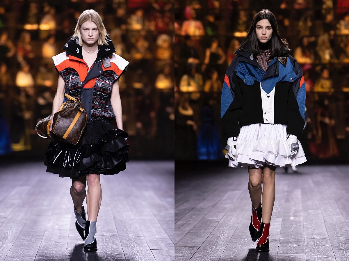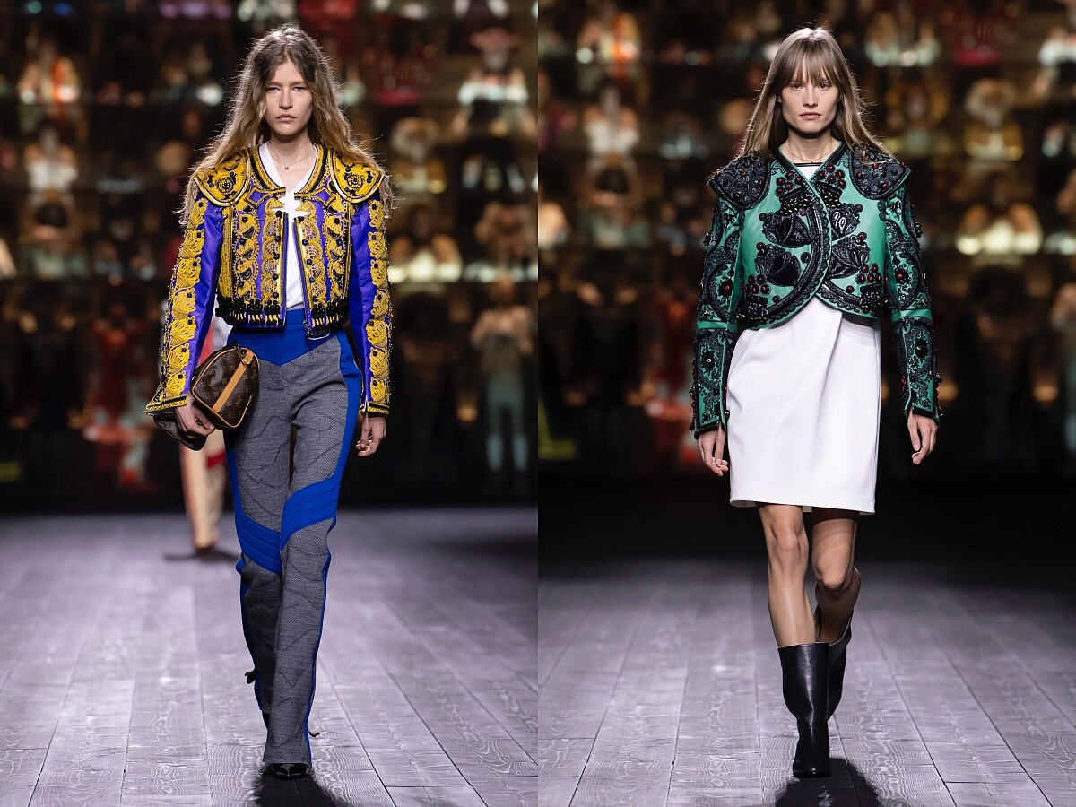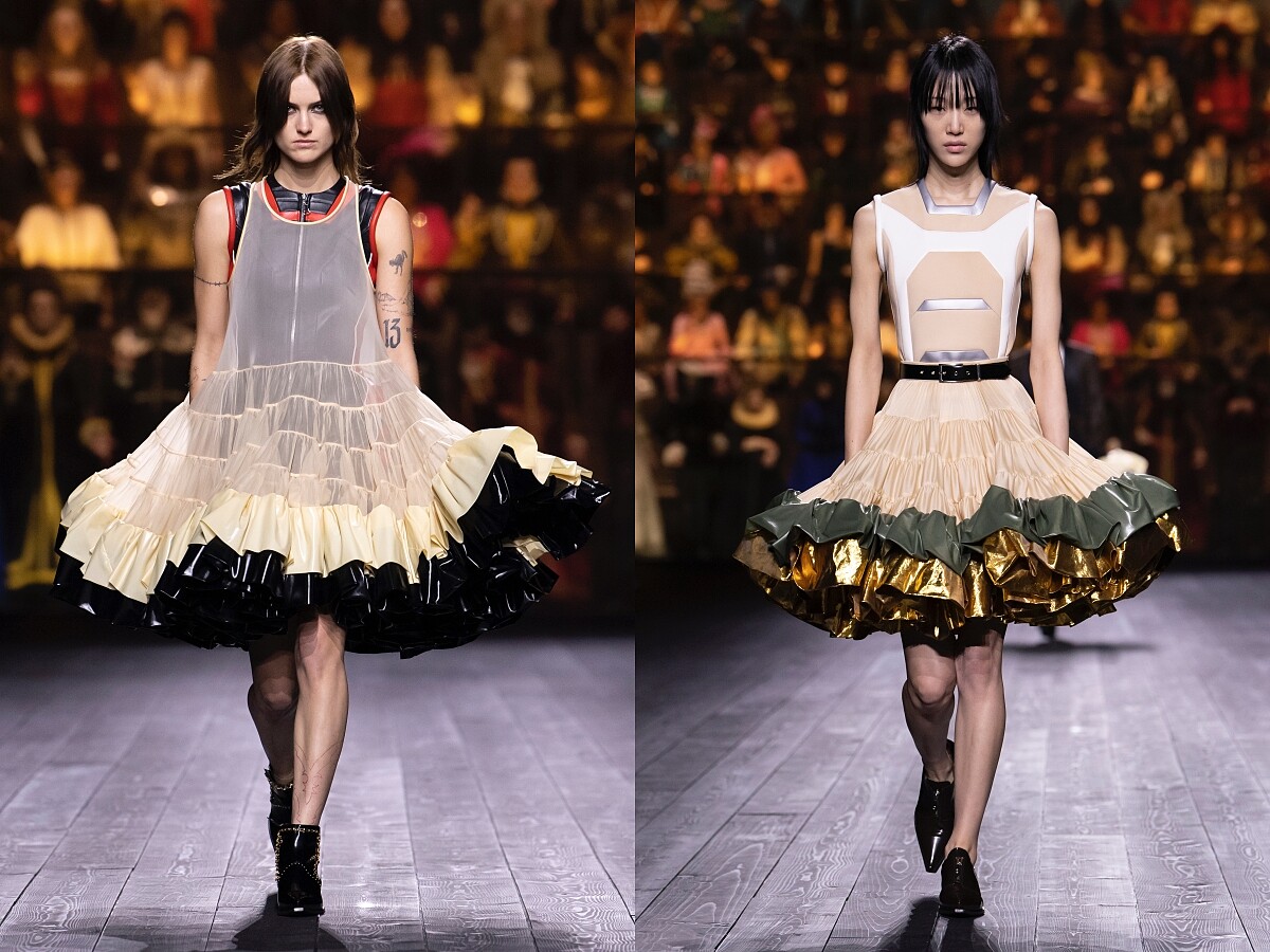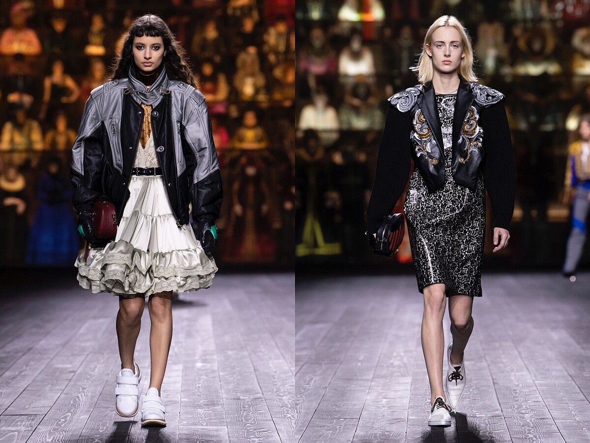 伸展台上,Nicolas Ghesquière新舊世代融合的設計、合唱團成員們的古典風格服裝,襯著磅礴的樂聲,讓這場大秀不只是欣賞Nicolas Ghesquière筆下設計的時刻而已,更是一場五感滿足的絕佳體驗。Nicolas Ghesquière以橫跨500年的時裝史為靈感,中古世紀宮廷風格的澎澎裙搭配未來感的機車夾克、騎士風格的刺繡夾克搭配機車褲裝,古典與現代交織、藝術性兼具功能性,不斷打破界線,顛覆人們的想像。
