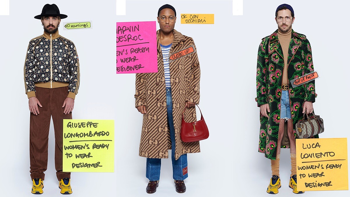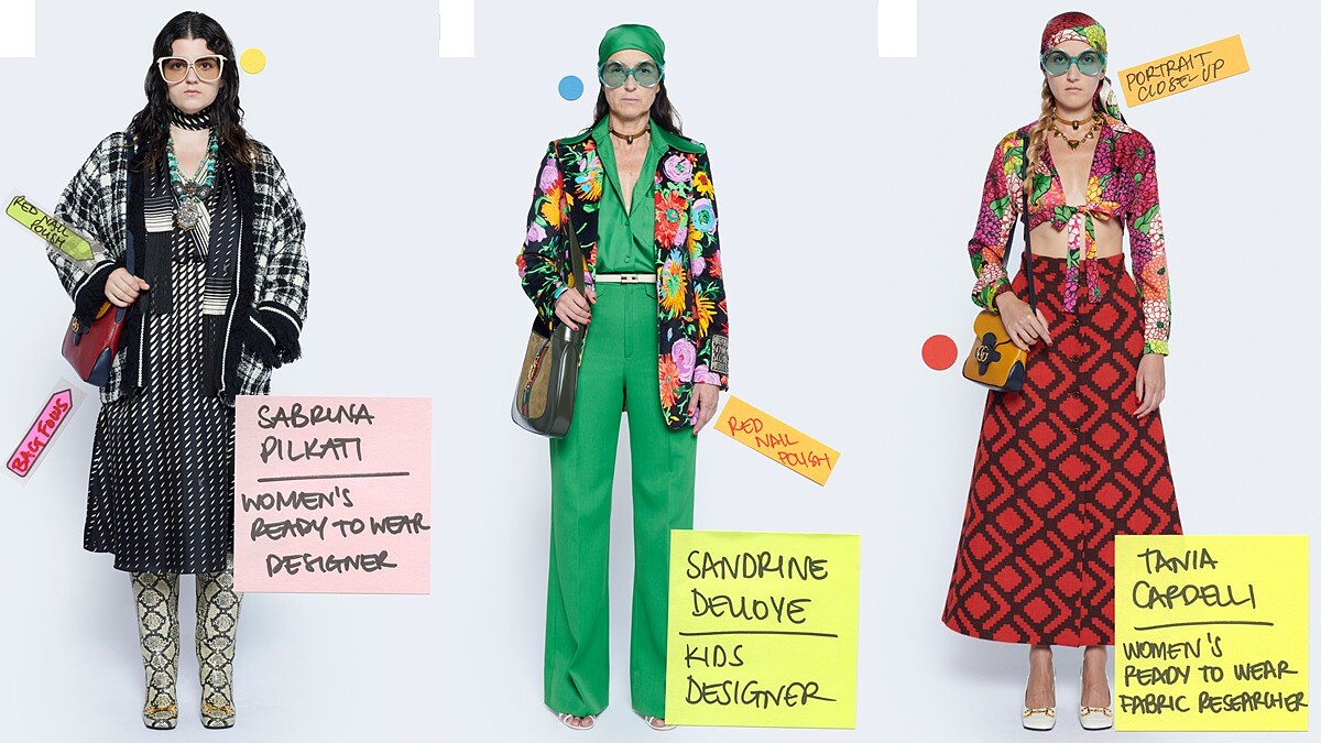每一個大秀的發表,創意總監往往擔任最重要的角色,不過這次Alessandro Michele選擇退居幕後,他放棄強迫症導演的工作,也放棄建構場景、模特兒動作、形象廣告拍攝…等項目,並邀請身為Gucci品牌的員工,擔任起「2020 Epilogue終曲系列」的模特兒,由他們自己擔任攝影師、製片人、場景編導等。有趣的是,每一張服裝圖片右下角還標註著員工任職的部門及職務。