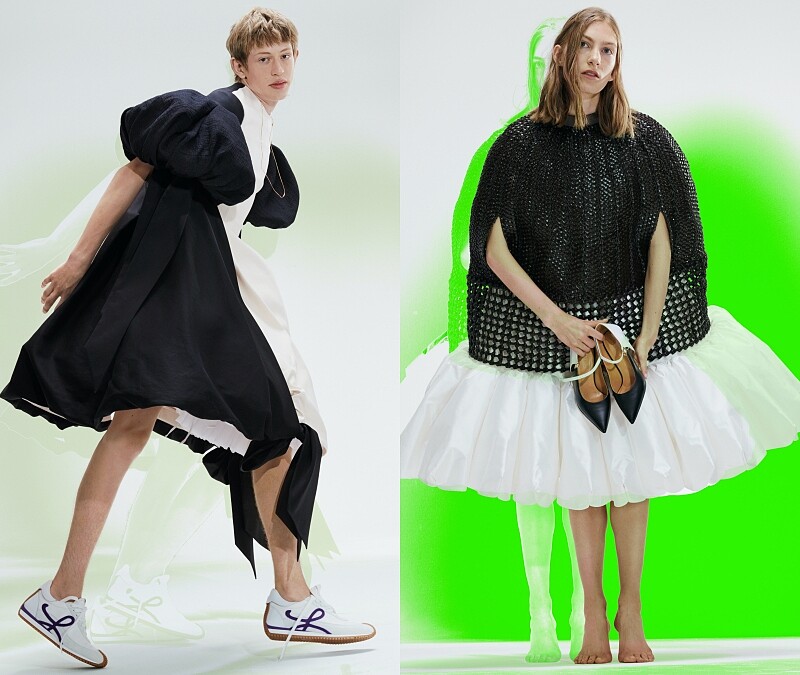 回歸到服裝本身,Jonathan Anderson本次將大量的鮮明輪廓套用於系列中,如誇張的弧線、皺褶,又或是隆起的垂褶及臀部線條等,完美襯出Jonathan Anderson擅長的剪裁技術,既夢幻又不失古典藝術氣質,同時隱喻在極具濃厚戲劇效果之服裝下,模特兒彷彿消失於無形,融為戲劇的一部份。配件方面則將標誌Puzzle包繡上珠片、增添解構細節的Balloon包、Flamenco上的打結設計、以及全新的亮眼貝殼包型,勢必都將成為下一季的發燒IT Bag!