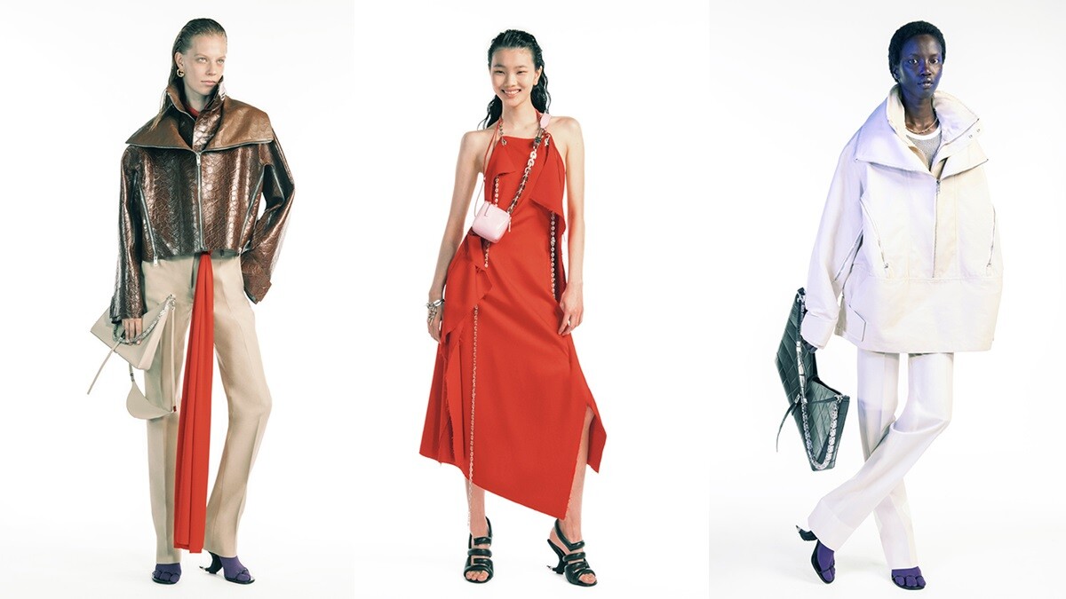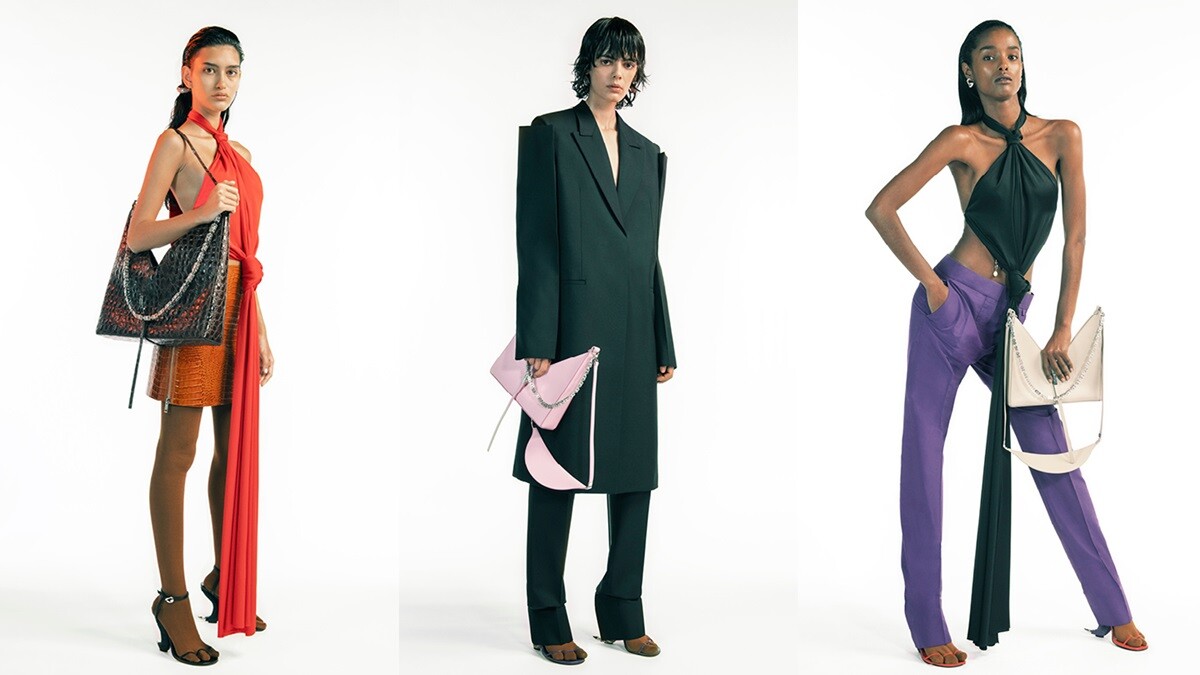 除了服飾與鞋履外,Matthew M. Williams的前衛風格更延續到配件上,推出嶄新山型包款。在外型上,猶如字母M一樣,中間有個凹槽設計,搭載亮眼的珠寶肩帶,整體相當符合品牌簡約的形象,此外,包款更擁有不同尺寸的大小,且提供手提、斜背、肩背等攜帶方式。