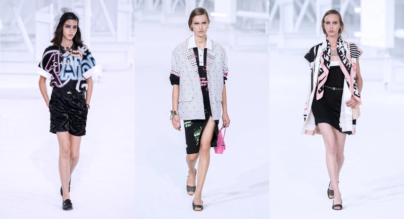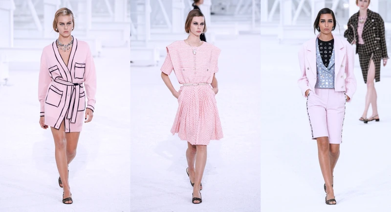 同樣選在巴黎大皇宮內舉辦2021春夏時裝秀的Chanel,本季秀場佈置捨繁崇簡,將前導影片中猶如洛杉磯Hollywooy Sign的巨型CHANEL標幟搬移至秀場,搭配上全白佈景,打造極簡卻不失華麗質感的時髦風貌,同時向第二支前導影片裡擷取自經典電影畫面,如Romy Schneider主演的《艷陽光》、Jeanne Moreau的《往死刑台的電梯》、與Anna Karina的《女人就是女人》等復古電影致敬。