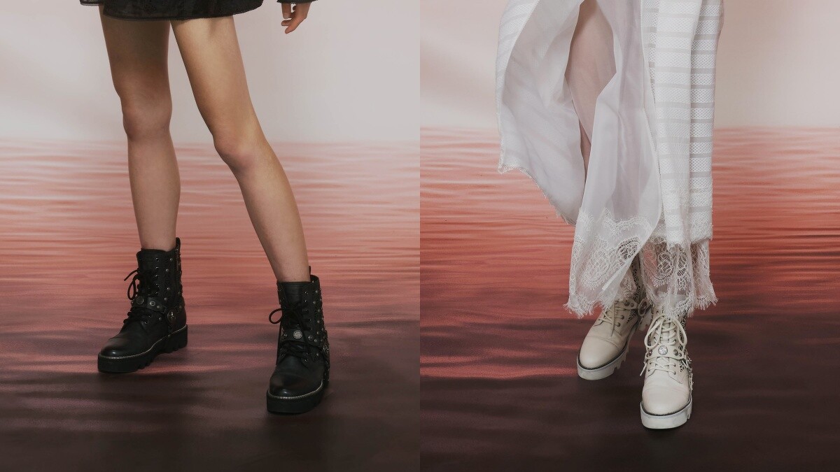 鞋履方面以馬具為靈感,像是短筒軍靴、平底涼鞋,皆點綴上皮帶與釘扣,與鞋後跟仿劍鞘扣飾呼應軍旅風格,展現花木蘭那亦剛亦柔的樣貌。