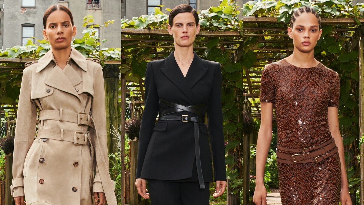 以清爽且溫柔的米白色、灰色、綠色、天空藍色及駝色作為2021春夏秀的主色彩,並在喀什米爾針織、絲緞、棉麻的混搭下,呈現柔和與飄逸兼具的服裝輪廓,而絲緞面料散發出的內斂光澤就如日落般光彩迷人,替沈穩針織衫撚入飄然仙氣。造型上也可看見Michael Kors先生在許多寬鬆的洋裝和襯衫外罩上了西裝背心,藉此賦予中性的正裝質感。配件方面則以大量編織手法替包身注入精準的線條輪廓和大自然寫意情懷,另外還有Double甚至Triple的腰帶組合,不僅勾勒腰身曲線,也替服裝佐上強烈視覺焦點。