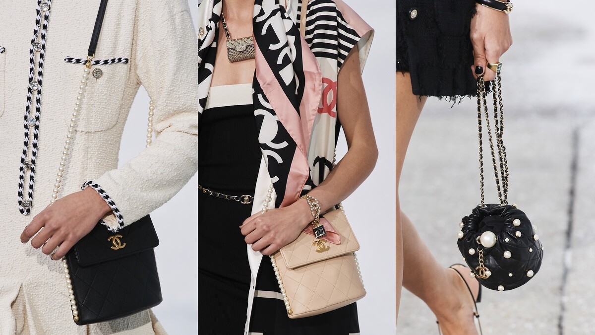 深受歡迎的珍珠元素延續到2021春夏系列,像是菱格紋肩背包就以皮革結合珍珠打造成背帶,從照片就能看出上架後造成熱烈搶購的盛況。