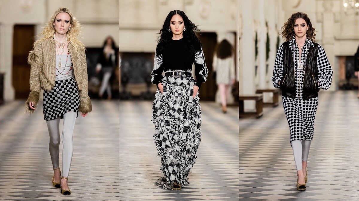 搶先曝光的城堡大長廊,有如西洋棋盤的黑白設計,也成為Virginie Viard的靈感來源,像是飾以黑白格亮片迷你裙、幾何拼接飾以流蘇的斜紋軟呢長裙、雙袖以白色緹花圖騰妝點的黑色毛衣…等。