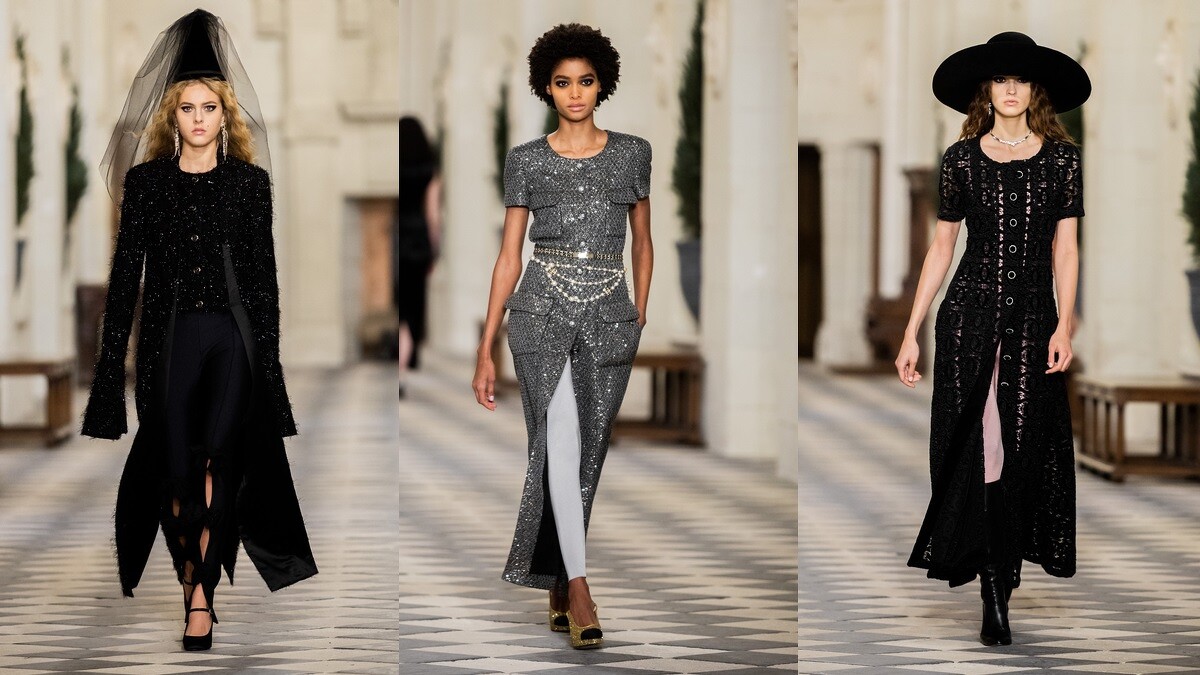 工坊大秀由Chanel麾下工坊齊心打造,其中鑲嵌鉚釘菱格紋裝飾的黑色蕾絲長洋裝由Lemarié刺繡工坊所製作,銀黑雙色厚底高跟鞋、黑色錐形反摺靴筒高跟長靴出自Massaro鞋履工坊,仿古代仕女禮帽的黑色大禮帽則由Maison Michel帽飾工坊製作。