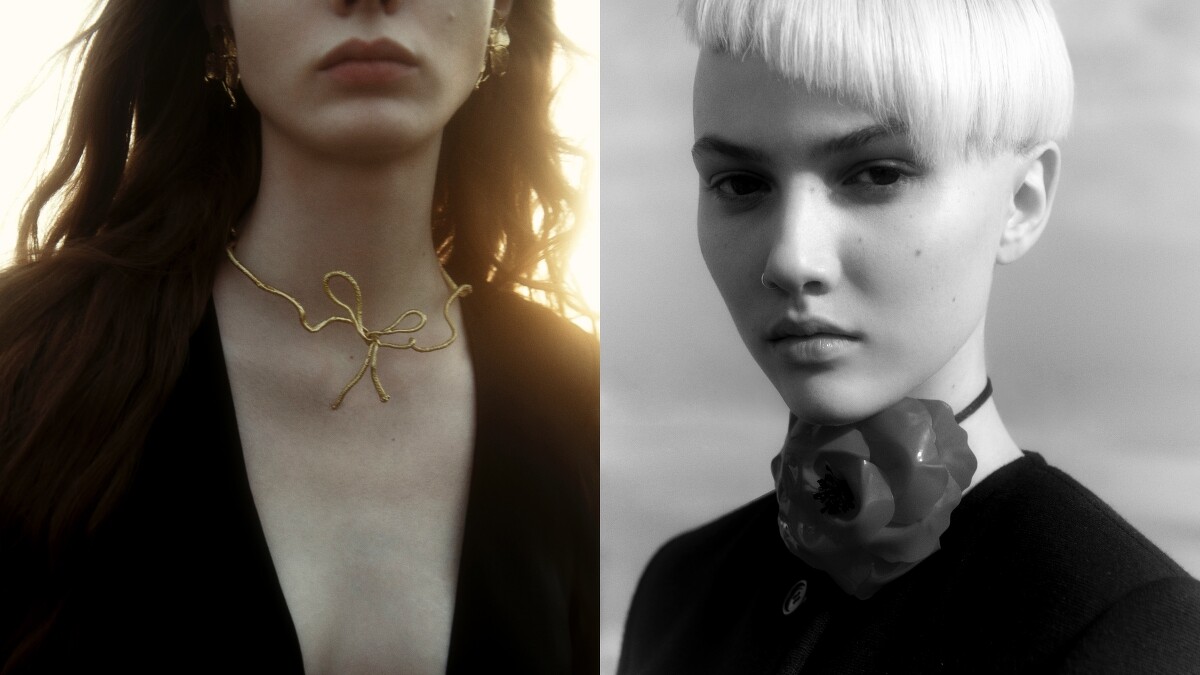 配件方面,多樣精緻又充滿古典前衛氣息的設計成功替衣著裝點上時髦氣息,好比繫於頸部的大朵立體花卉、猶如蝴蝶結綁帶的金銅頸鍊、方尖頭的曲線高跟鞋…都成了造型上不可獲缺的重要配襯。