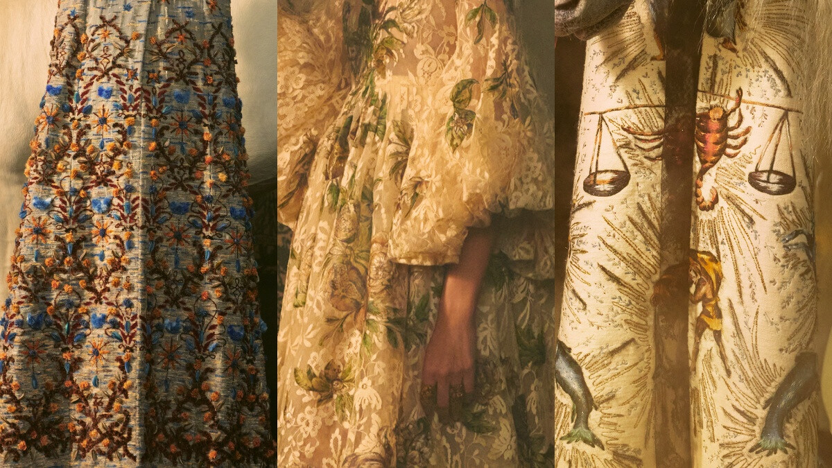 在影片的開場,便可見占卜師在替一位女子解說她所選擇塔羅牌,緊接著塔羅牌化作為開啟神秘世界的鑰匙,模特兒便化身成塔羅牌中的女祭司、皇后、正義及愚者...等角色,透過Dior精湛的高訂工藝,為角色們的華服增添亮點,像是蕾絲鑲嵌手繪裝飾、金色天鵝絨蘊藏星座元素、點點繁星灑落細膩的緹花面料,以及五彩斑斕的羽毛綻放於斗篷大衣。