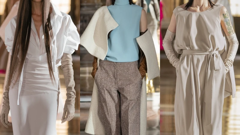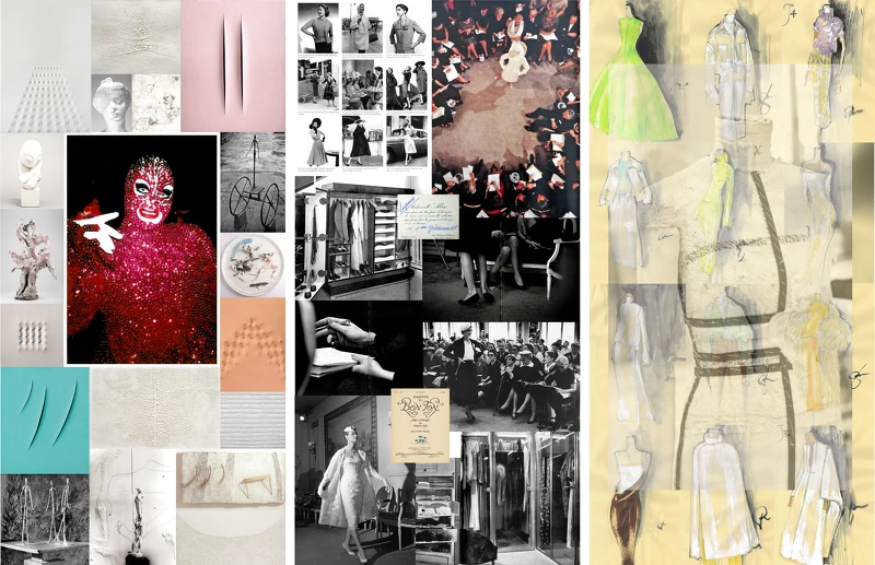 設計師以刪繁為簡作為設計理念,卸除繁雜多餘的裝飾,運用誇裝廓形、褶皺設計及俐落的線條美學貫穿,無需任何飾品的加持,呈現高訂服飾固有的氣勢。