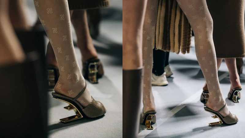 吸睛單品可不只包包,模特兒腳上踩的建築風格F字造型跟鞋,是Kim Jones擷取典藏資料庫的草圖檔案,結合當代美學所設計而來的Fendi First鞋款。