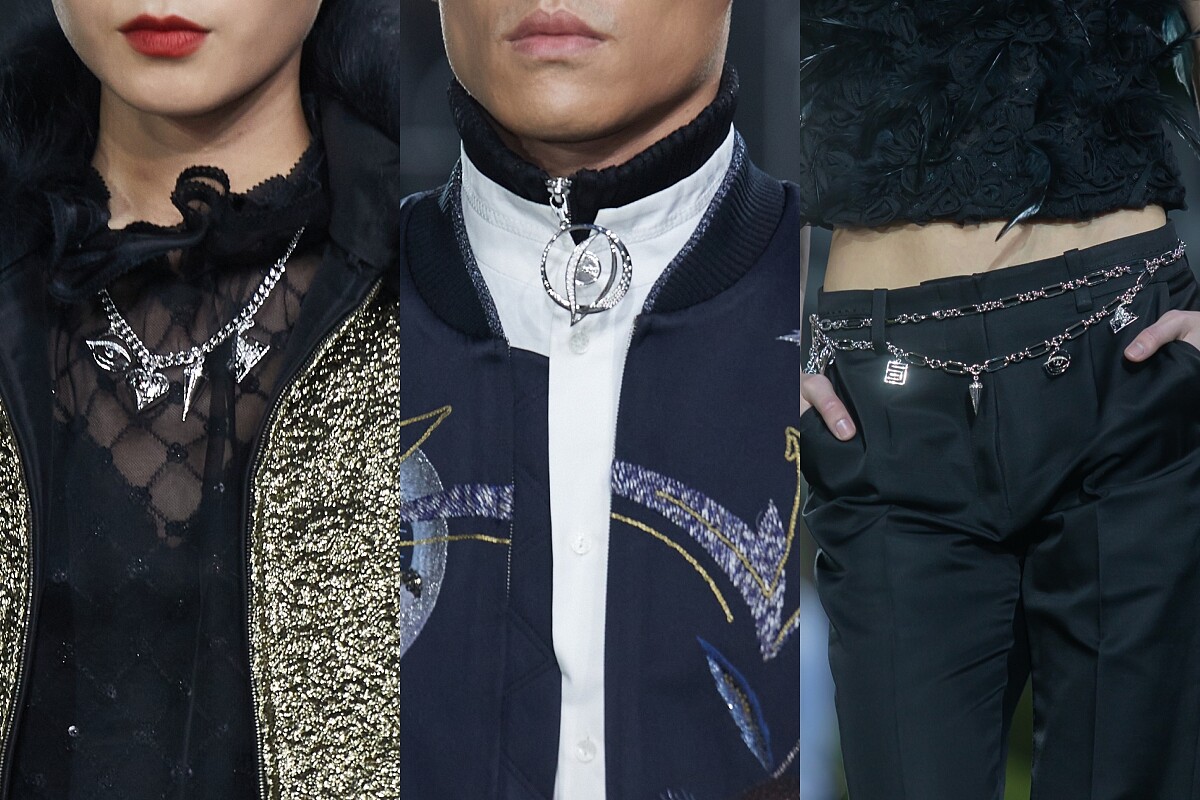 本季的服飾上有許多圖騰的運用,以超現實主義的風格為基底,配上帶有叛逆感的街頭圖塗鴉手法,將指針、沙漏、眼球、愛心、門扉⋯⋯漩渦式的串連在一起,呈現出一種時空流轉的畫面。