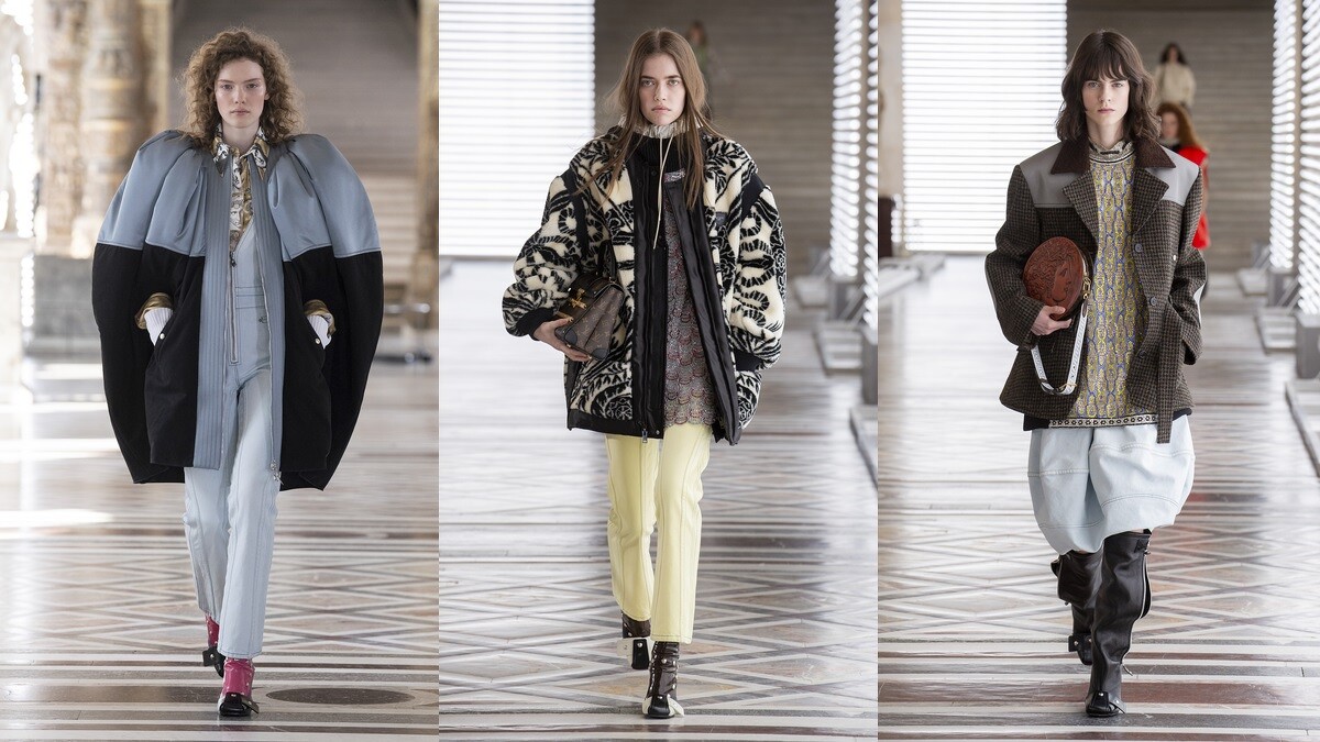 在服裝上除了展現秋冬季的針織元素及蓬鬆斗篷造型外套,在裙子設計上也重複了氣球造型,最吸睛的莫過於Fornasetti繪畫作品大量融入服裝單品中,像是夾克外套、西裝式背心、連身洋裝…等,同時也傳遞Nicolas Ghesquière想表達的希臘羅馬風情。