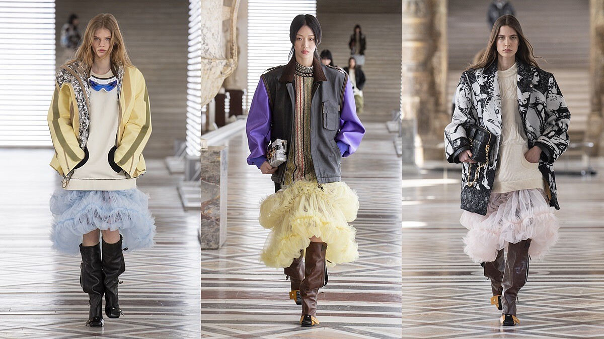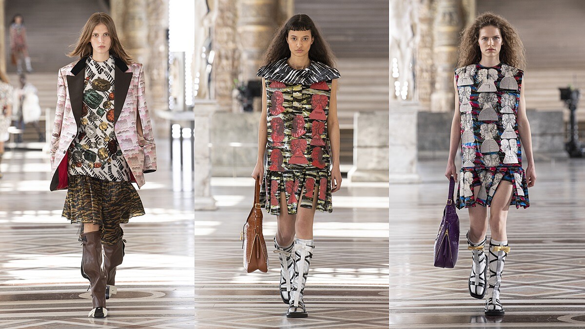 在服裝上除了展現秋冬季的針織元素及蓬鬆斗篷造型外套,在裙子設計上也重複了氣球造型,最吸睛的莫過於Fornasetti繪畫作品大量融入服裝單品中,像是夾克外套、西裝式背心、連身洋裝…等,同時也傳遞Nicolas Ghesquière想表達的希臘羅馬風情。