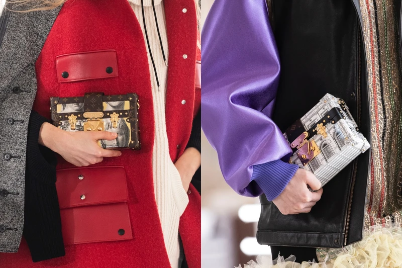 路易威登本季最新包款,外型呈現方型U字,純色皮革上加以品牌經典老花圖樣的金屬綴飾,秀上一共出現黑、藍、棕與紫色4種顏色的包包。