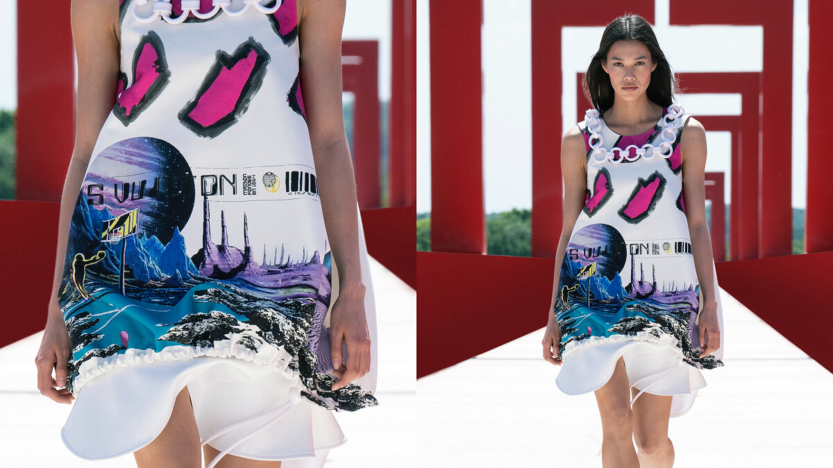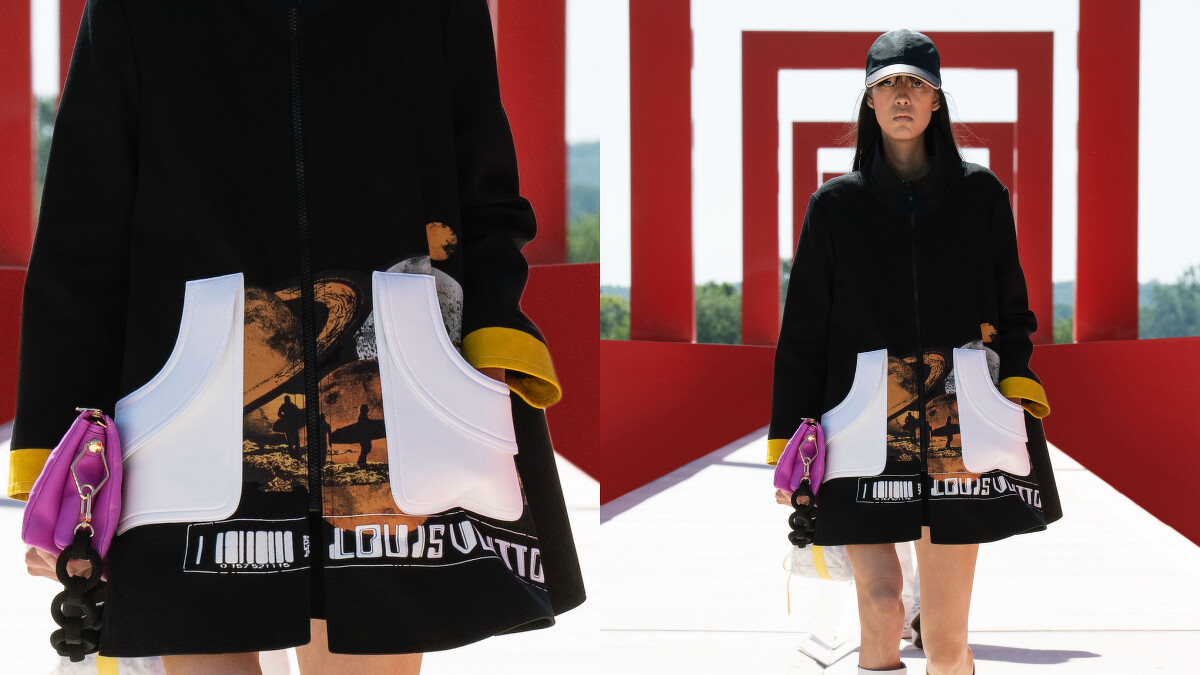 在Axe Majeur裡的紅色拱門,讓Nicolas Ghesquière想起1997年開播的影集《星際奇兵》。拉近一看,在太空的塗鴉當中,還有著人們在地球上生活的日常——商品條碼、打籃球、旅館等圖樣,疊加在其中。Nicolas Ghesquière大膽的想像,在不久的將來,或許我們都可以登上火箭、遷移到其他星球生活居住,造就了本季出現這一系列服飾上出現外太空+地球生活的圖畫。