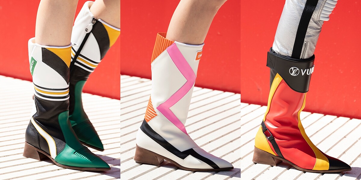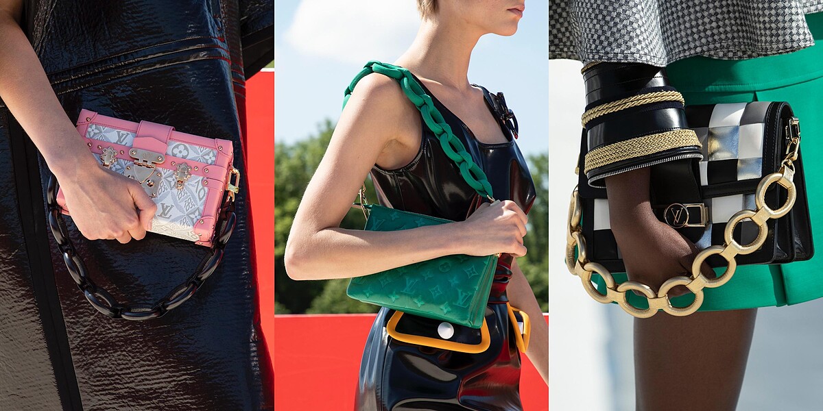 而最受時尚迷關注的LV包款,路易威登將明星包款如Coussin PM、Petite Malle等在今年換上皮革的鏈條揹帶,圓潤的外型帶點萌感;鞋履方面,則是以幾何圖形撞色拼接的尖頭靴為最大宗。
