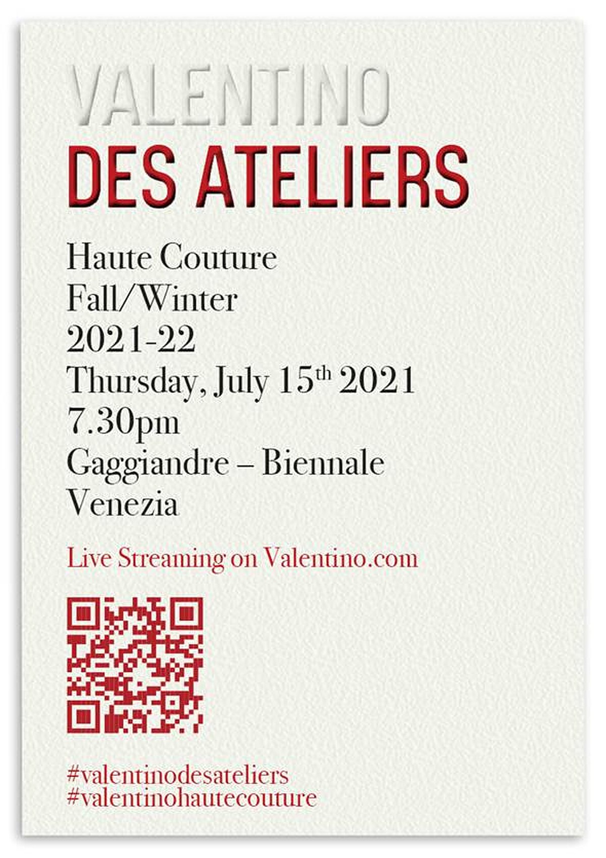 即將登場的Valentino 2021秋冬高訂大秀,創意總監Pierpaolo Piccioli將本季主題取名為Valentino Des Ateliers,並選在藝術、劇場、音樂、建築、電影以及各項創作的搖籃「威尼斯」舉辦,同時聯手威尼斯雙年展,把大秀搬到威尼斯軍火庫船塢區發表。