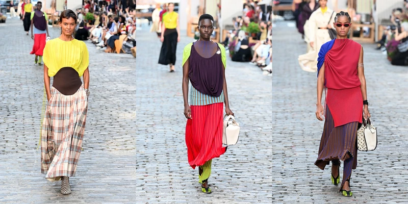 除此之外,也可以看到許多顏色對比強烈的面料相互搭配,創造出一種活潑、雀躍的春夏氛圍。