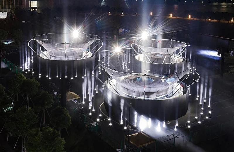 先看到位於上海的展演系列,表演者們分別站在三個風洞並懸浮於空中,這場表演展現了無重力的概念,尤其 Moncler Grenoble 系列表達了對高實用與機能性的高度追求。