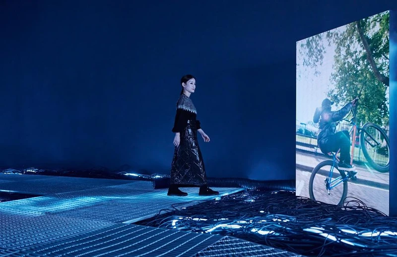 接著看到在現實與虛擬間,Moncler FRGMT 系列攜手時尚迷不陌生的潮流教父藤原浩,製作出一系列有獨特創意又有著神秘感的實用裝束,在黑暗的空間中,發光的電纜連結著各個螢幕,主要是想表達人類在數碼世界中的共生現象,值得一提的是,主持人宋茜也成為作品中的一部分,代表著無限創意,漫步在虛擬與現實之中。